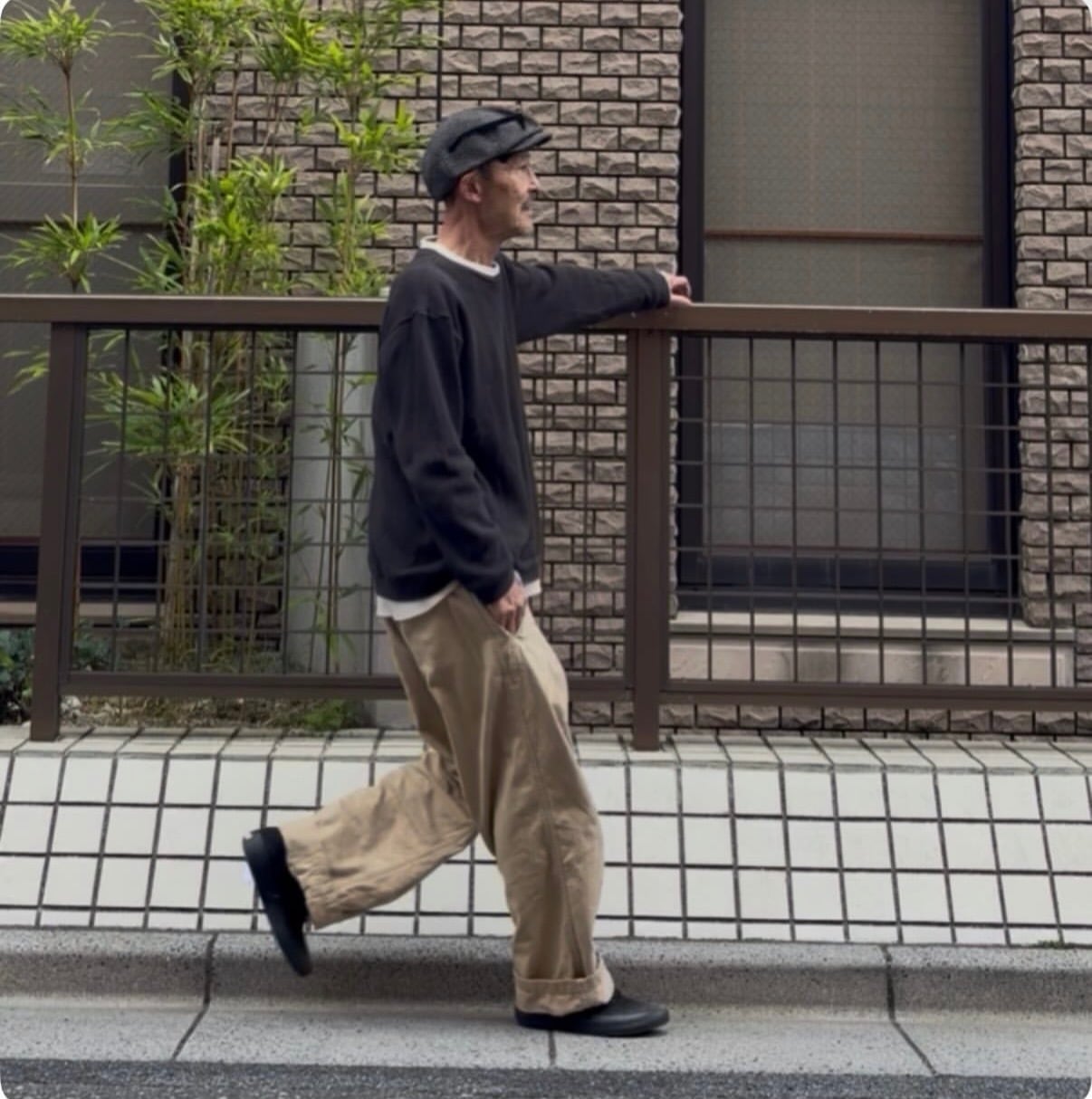 20年以上使い続けているミニ裏毛 さてミニ裏毛とは? 通常の裏毛(スウェット)との違いは? ズバリそれは糸の太さの違いになります 一般的なスウェットは30/10番という表が30番手 裏側が10番手という太さの糸を使用するのですが ミニ裏毛は40/10番という糸を使用します 糸の太さの単位を番手と言い数字の大きい方が 細い糸になります ですから一般的なスウェットに比べ薄手で裏のループも細かくなります 見た目や着心地はスウェットとロンTの中間と思っていただければ良いと思います そんなミニ裏毛を使ったプルオーバーベストになります ネック アーム 裾にはリブを使用 サイドにポケット付き 身幅や着丈は123MUリブクルーネックと同じ 特徴的なのはアームホールを大きく取ったところです 昨今のビッグシルエットを着用しても脇がつってしまうことはないと思います ロンTでも半袖Tでも またシャツでも シンプルなスタイルのアクセントとなると思います 素材:綿100 サイズ40号〜46号 4サイズ カラー スミブラック グレー マロン ブラウン ネイビーの5色 サイズ 着丈 身幅 40号 50センチ 63センチ 42号 52センチ 65センチ 44号 54センチ 67センチ 46号 56センチ 69センチ