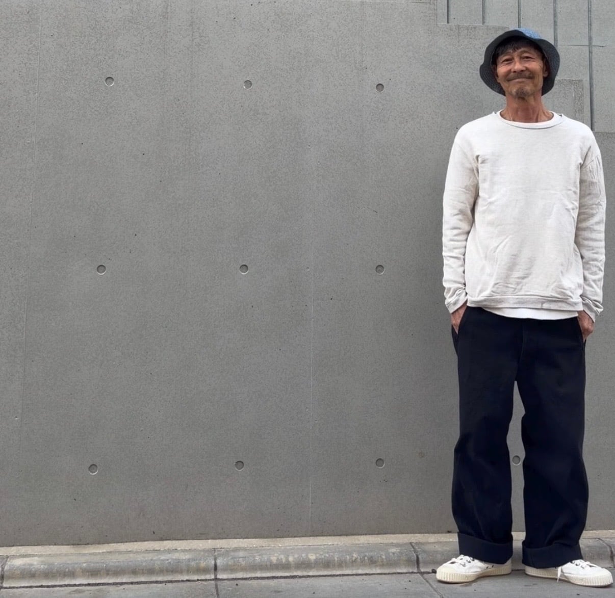 20年以上使い続けているミニ裏毛 さてミニ裏毛とは? 通常の裏毛(スウェット)との違いは? ズバリそれは糸の太さの違いになります 一般的なスウェットは30/10番という表が30番手 裏側が10番手という太さの糸を使用するのですが ミニ裏毛は40/10番という糸を使用します 糸の太さの単位を番手と言い数字の大きい方が 細い糸になります ですから一般的なスウェットに比べ薄手で裏のループも細かくなります 見た目や着心地はスウェットとロンTの中間と思っていただければ良いと思います そんなミニ裏毛を使ったリブクルーネックのロングスリーブになります ビッグなシルエットではなく適度な緩さを持ったルーズシルエット 袖口 裾に使用しているリブもあまりテンションをかけず緩めですので締め付けはなく少し着込んで緩くなってきたかなという状態で仕上げています ファッション業界でよく使われるヌケ感のある着こなしがオートマチックに可能になった商品です 付け加えてサイドにスラッシュポケット付き 素材:綿100 カラー10色 サイズ4展開 40 42 44 46 着丈 66 68 70 72 身幅 52 54 56 58 肩幅 45 47 49 51 袖丈 54 56 58 58